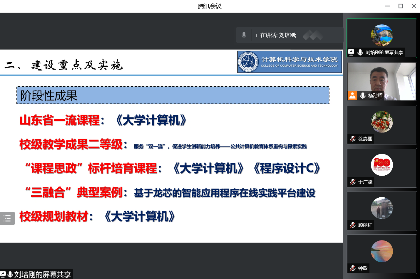 为做好本次课程建设总结汇报,大学计算机课程团队骨干成员事先专门召开研讨会,总结梳理了课程建设期间取得的成果,对照《中国石油大学(华东)“基础课程振兴计划”实施方案》要求与《大学计算机课程建设方案》建设目标,对整体目标达成情况进行了分析,在此基础上制订了2022年建设计划和重点工作,为这次汇报研讨工作做了充分准备。