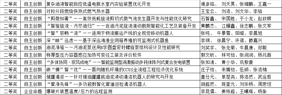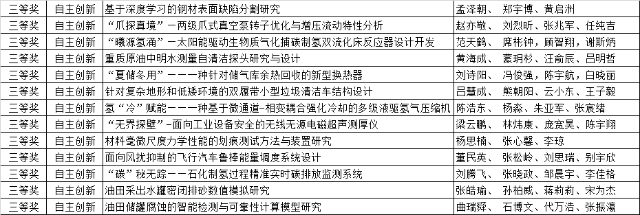 自2025年4月9日发布赛事通知以来,全校多个专业多名同学组队踊跃报名参赛。经材料初审、现场答辩,中国石油大学(华东)第四届过程装备实践与创新赛校赛共评出一等奖8项、二等奖13项、三等奖13项,其中一、二等奖作品推荐参加山东省省赛,现将评审结果进行公示(排名不分先后)。