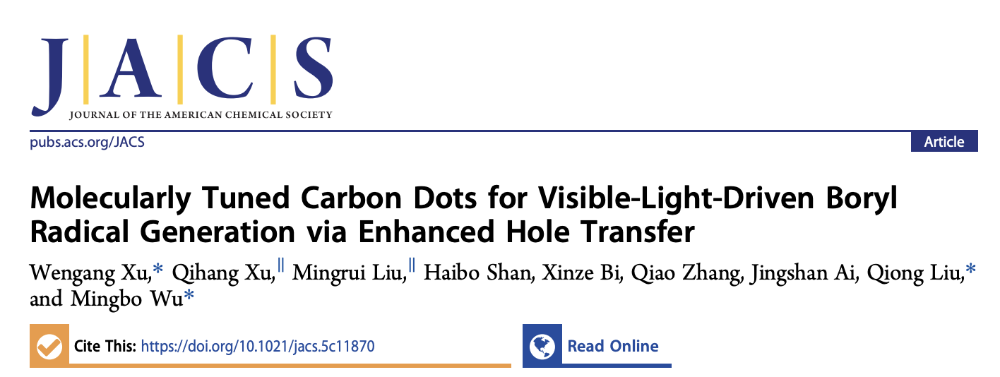 相关成果以“Molecularly Tuned Carbon Dots for Visible-Light-Driven Boryl Radical Generation via Enhanced Hole Transfer”为题,发表于《美国化学会志》(JACS)。徐文刚副教授为第一作者,中国石油大学(华东)徐文刚副教授、吴明铂教授和广东省科学院刘琼研究员为共同通讯作者,中国石油大学(华东)为第一署名单位。该研究得到国家自然科学基金和山东省自然科学基金资助。
