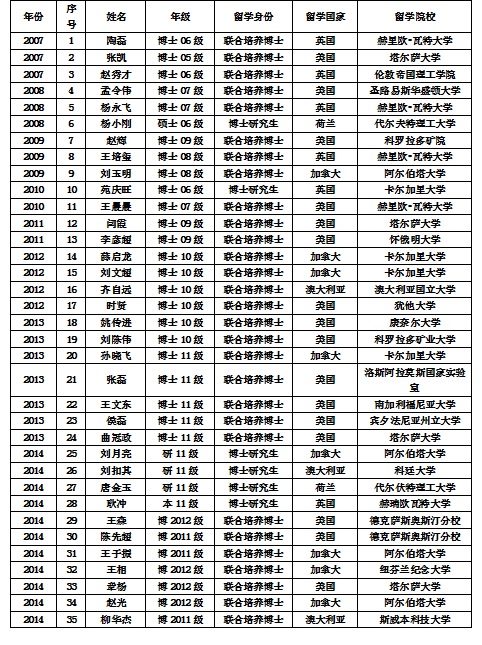中国石油大学(华东)于2012年开始执行CSC项目,学院首批只派出了4名优秀本科生赴科廷大学和新南威尔士大学进修,2015年项目外派人数已增加到28人,国外合作院校已发展到了10所。派出的优秀本科生生源质量受到国外指导教师的一致好评,学生修完回国后,约25%学生选择出国继续读研深造,约75%学生被国内高校保研。具体派出情况见下表。CSC优秀本科生项目派出情况
