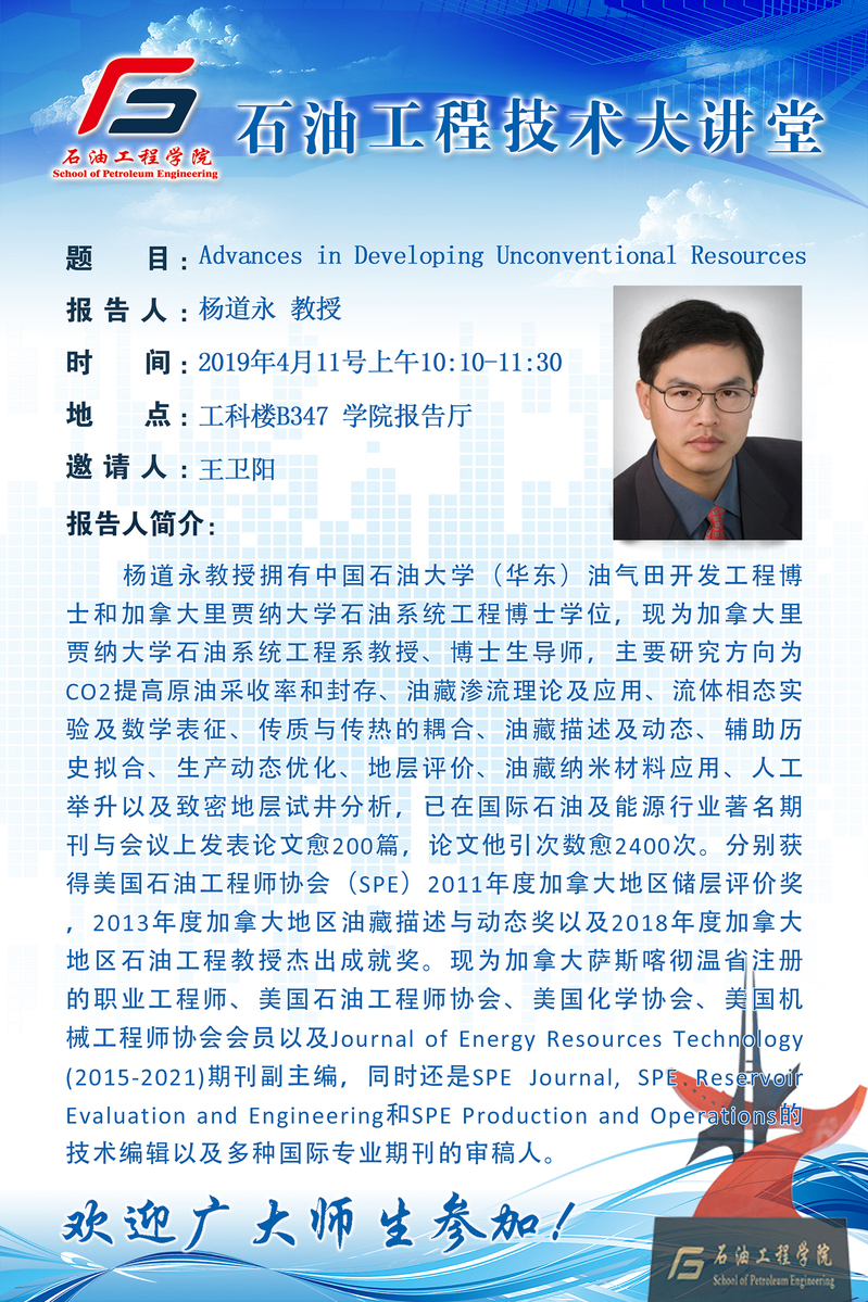 【石油工程技术大讲堂(第12期)】 杨道永教授学术报告