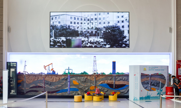 学院大厅抽油机模型与“梦想油桶” 王先祺摄