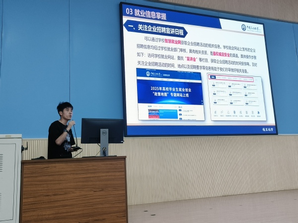 随后,6名学校就业指导中心的学生助理、学院2022级本科生史鸿飞、崔跃钟、张昭勖、宋嘉轩、王瑾、孙希硕结合所参与的2025届毕业生就业工作和个人体会,从毕业生去向落实情况、签约单位概况、信息搜集途径、就业相关手续办理、就业指导中心基本情况、“智慧就业网“使用、毕业要求及学分自查工作等方面进行分享,内容涵盖了毕业生就业相关的各方面,发挥了良好的朋辈互助作用。