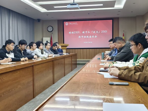 【本站讯】为强化学风建设,引导同学们树立远大目标,11月25日,碳储科学与工程系组织召开了期中师生座谈会。副院长贾寒、碳储系副主任王文东和辅导员杨琪硕参加会议,与碳储2501、碳中和2501全体同学进行了深入交流。