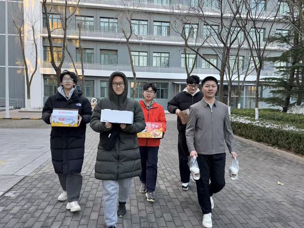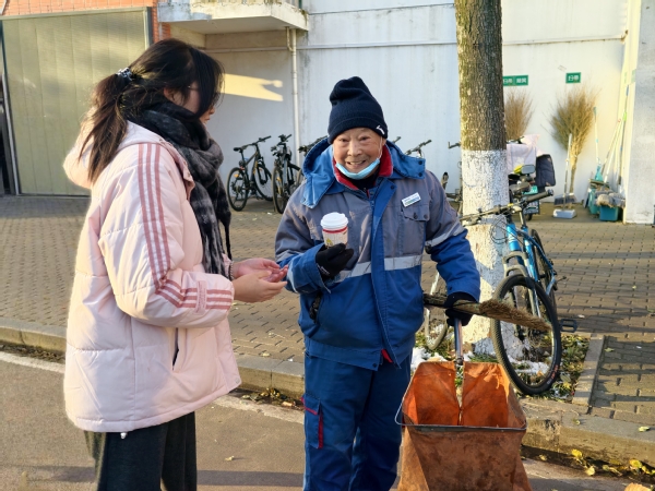 为提升派送效率、实现全覆盖,两支志愿者队伍分路行动,分别沿“10-17号楼物业—食堂—西北门门卫”与“1-9号楼物业—18-19号楼物业—北门门卫”两条路线同步推进。晨光中,志愿者们的身影穿梭在校园的各个角落。他们将热牛奶递到刚完成早间巡逻的保安师傅手中,送到正细致整理宿舍记录的宿管阿姨手边,也把这份温暖传递给正弯腰清扫路面的环卫工人心里。“天这么冷还想着我们,太暖心了!”宿管阿姨接过热饮时,紧紧握住志愿者的手,脸上的笑容驱散了寒意;环卫工人捧着温热的杯子,一声声真切的“谢谢”,成为这个清晨最动人的回响。