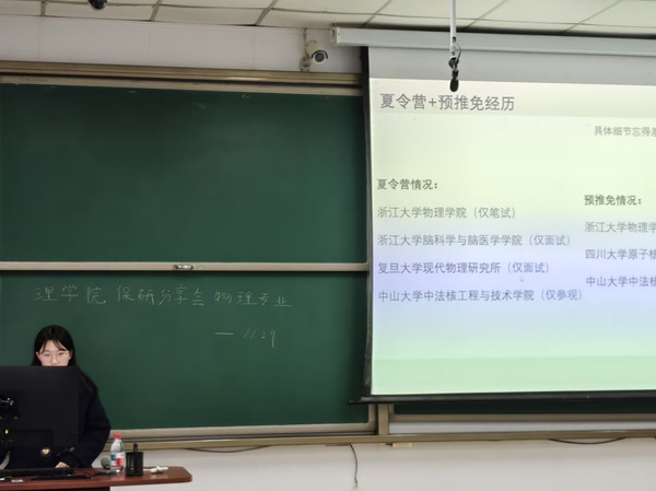 物理专业保研经验分享会上,马克典强调科研实践是保研的核心竞争力。她建议低年级生尽早参与“挑战杯”等权威竞赛,并主动通过学院官网联系导师。“科研经历不仅提升简历,更能培养批判性思维”。杨诺璇聚焦英语学习与跨校交流。她指出六级高分( 600+ ) 是名校夏令营的“隐形门槛”,并分享通过海外暑期学校 提升背景的经验。“国际交流经历能显著增强个人陈述的说服力”,她建议学生善用学校国际处资源。刘昱达提出“三阶段学习法”:课上速记重点、24小时内整理笔记、每周复盘知识框架。他特别展示自制的物理专业课思维导图,强调“构建知识网络比刷题更重要”。范巧溦针对保研焦虑分享应对策略:“夏令营未通过不等于失败,预推免仍有40%机会”。她详细解析推荐信写作要点,提醒学生“避免模板化,用具体案例体现学术潜力”。吴雨昕结合跨保经历,指出“物理背景在交叉学科中的独特优势”。他揭秘面试高频题:“用5分钟解释你的科研项目”——建议用“问题-方法-创新点”三段式回答。