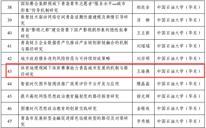 近日,中共青岛市委宣传部公布了2025年度青岛市哲学社会科学规划研究项目立项结果。我部青年教师王海燕博士申报的《体育地理视阈下体育赛事助力青岛城市发展的机制与路径研究》成功立项。