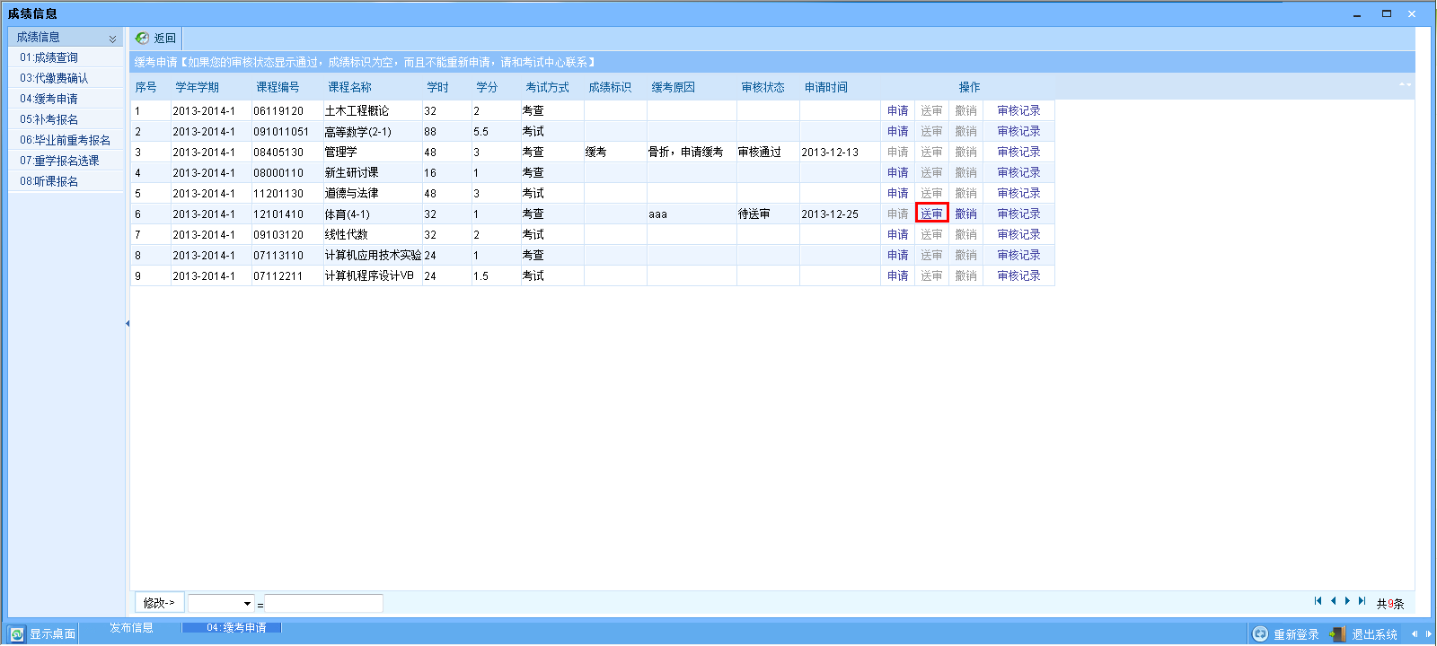 6、确认该门课程缓考并且申请理由无误的情况下,请选择“送审”。