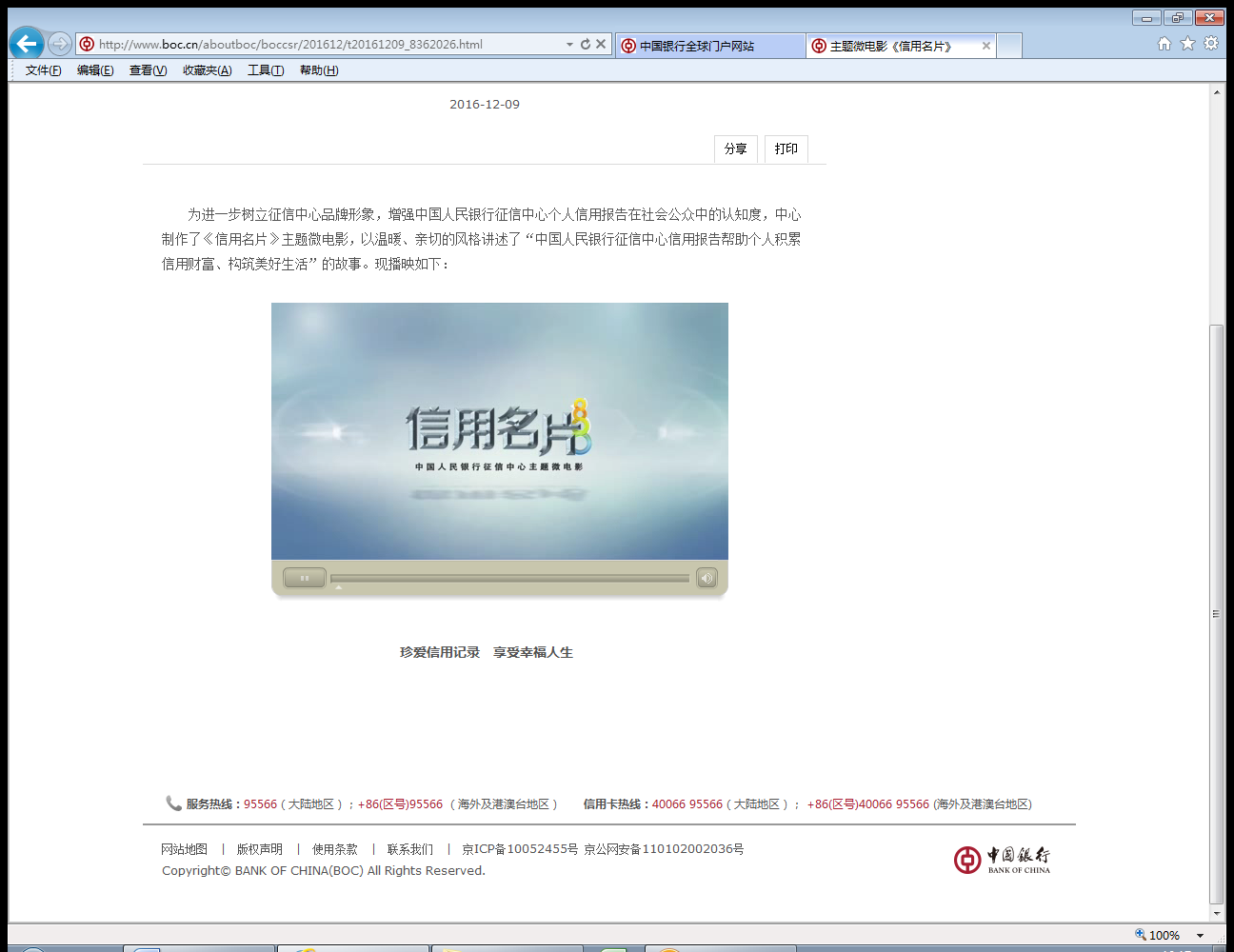 为进一步树立征信中心品牌形象,增强中国人民银行征信中心个人信用报告在社会公众中的认知度,中心制作了《信用名片》主题微电影,以温暖、亲切的风格讲述了“中国人民银行征信中心信用报告帮助个人积累信用财富、构筑美好生活”的故事。观看网址: